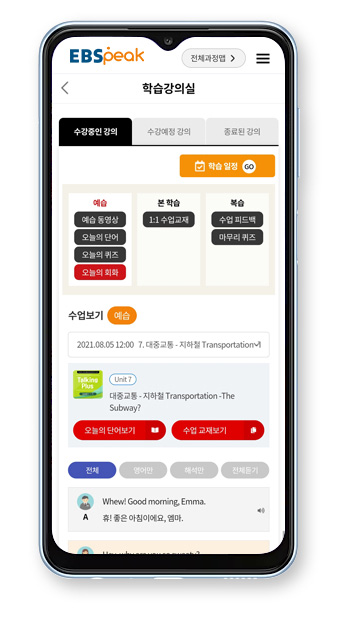 | 장점 | 따로 준비할 것 없이 전화 사용만 되면 수업이 가능 시간,장소 제약이 거의 없음 모든 수업의 녹취파일 듣기&다운로드 가능 |