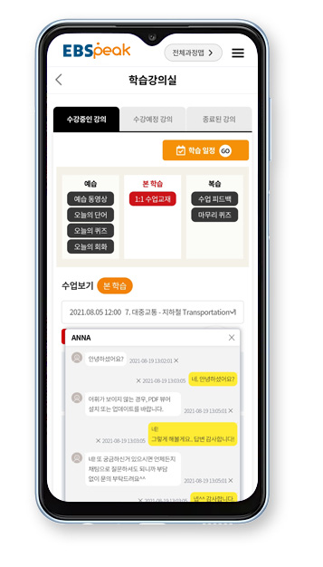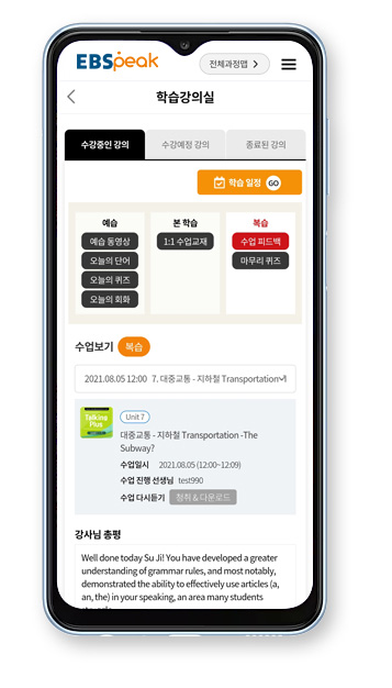 화상방 입장. (PAGODATALK 알림톡 차단 시 문자로 전환되어 발송) 정해진 수업시간(10분,15분,20분) 동안 스마트폰이나 PC로 선생님를 보며 수업을 진행 교재공유, 전자칠판 기능을 통해 수업 중 발음, 문법 교정을 해주며, 수업 후에는 마이페 이지에서 수업후 코멘트(발음,문법)를 보며 녹화파일로 복습 ※ 수업 녹화파일은 수업일 기준 14일동안 다운로드 가능 |